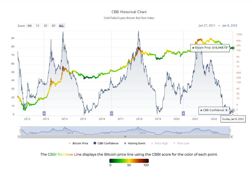 The CBBI is a Bitcoin index that utilizes advanced, real-time analysis of 10 metrics to help us understand what stage of the Bitcoin bull run and bear market cycles we are in. The CBBI is time-independent and price-independent. It simply indicates whether it believes we are approaching the top/bottom of a Bitcoin cycle. Link.