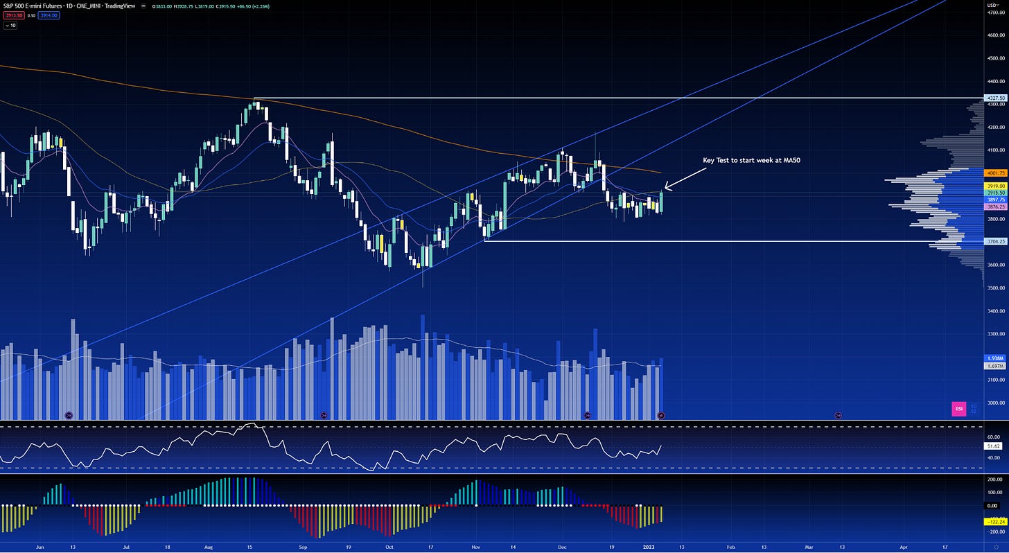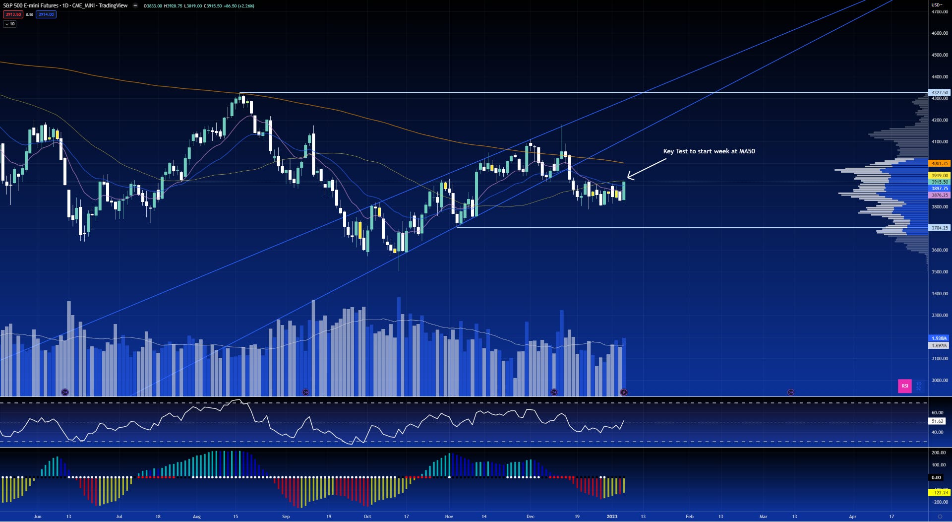 Last newsletter I was looking at this ascending wedge on ES and we can see we broke bear since that time but with little follow through. This tells me we are likely in a consolidation range and near a point of control. This selloff coincided with the loss of the psychological level of 4000. The 200MA is now sitting around that psychological level as resistance. Bulls have some work to get back over that level again otherwise the bears will take back control here. To start the week, we are positioned to break and hold the 50MA and set some supports there for some continuation. I expect some big volatility as bulls had the big win on Friday and bears will want to try and push back and hold the rally where it’s at. How Monday opens will likely dictate the sentiment for the rest of the week.