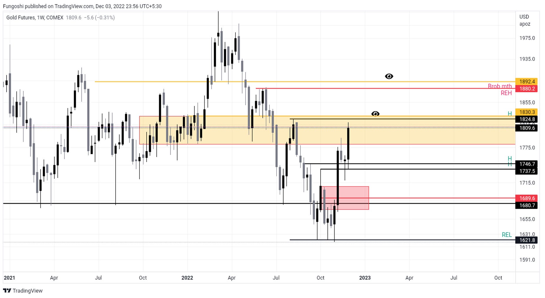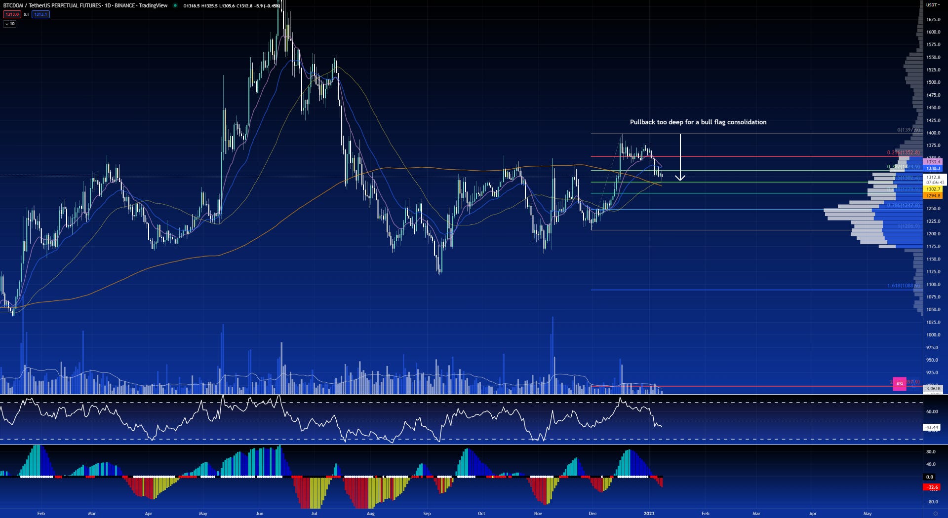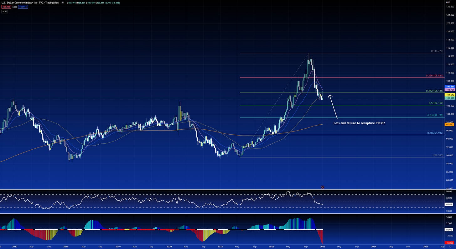 Since it’s peak in September we can see that the Dollar has steadily sold off, helping with the Q4 rally in traditional markets. However, this consolidation lost the Fib382 meaning the retracement is greater than what would be considered a bull flag. To me, this means that even it if rallies from this point, we’d be scouting a lower high below the 114 peak. With a lower high in mind, it could be the beginning of a multi quarter equilibrium and then further selloff, creating a good catalyst for good market rallies into 2024.