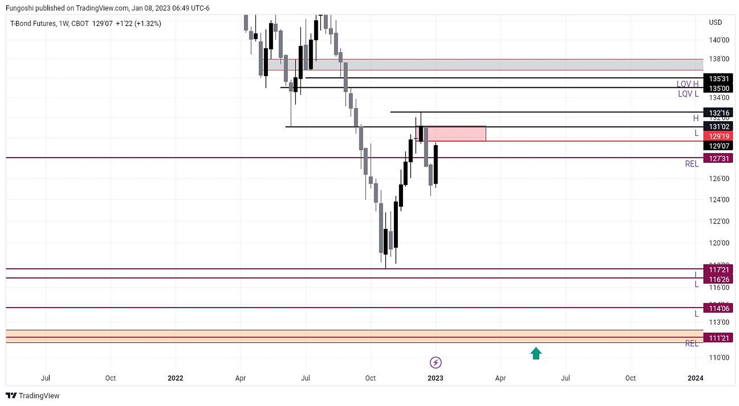 For analysis on bonds I will be switching over to ZB futures instead of the TLT ETF, because ZB futures provide much cleaner price action. We are in a tricky spot at the moment, as 132’16-129’19 is the area that price is sensitive to and likely to react from. I will be just observing how price behaves for now. We could also have a big momentum bar and a breakout from here but then go much more deeper into resistance, as well. For now, just wait and observe mode is on. The overall longer term trend hasn’t changed yet, its still down but how far we will go on this rally needs to be taken into consideration.