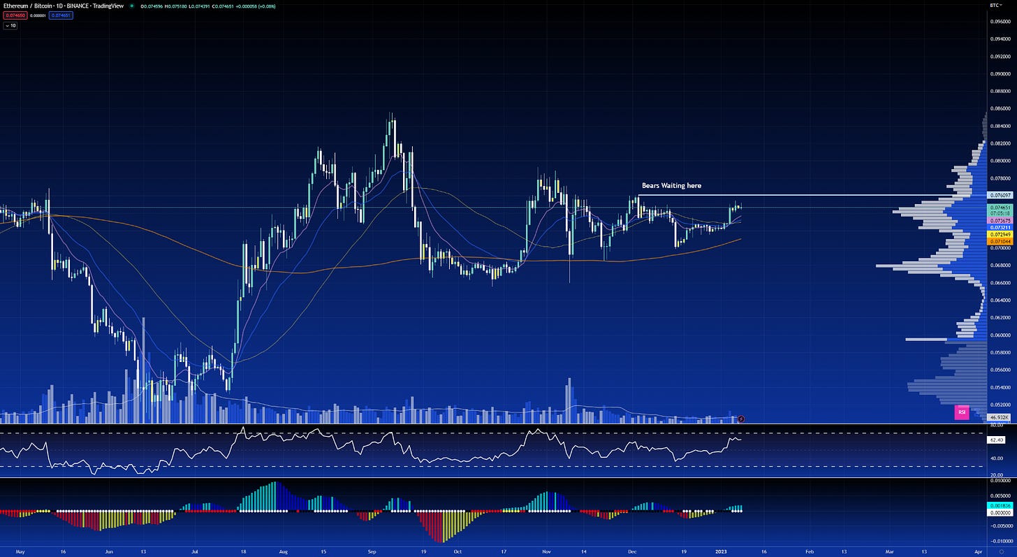 Although ETH is having a good run and dominating BTC, we are coming to a key S/R level (mentioned in a previous newsletter) and the ETH bears may put up more of a fight. That being said if the bulls can get a major volume push there could be a big cascading liquidation event above this level sustaining the rally even further. The next few days will be key for ETH bulls.