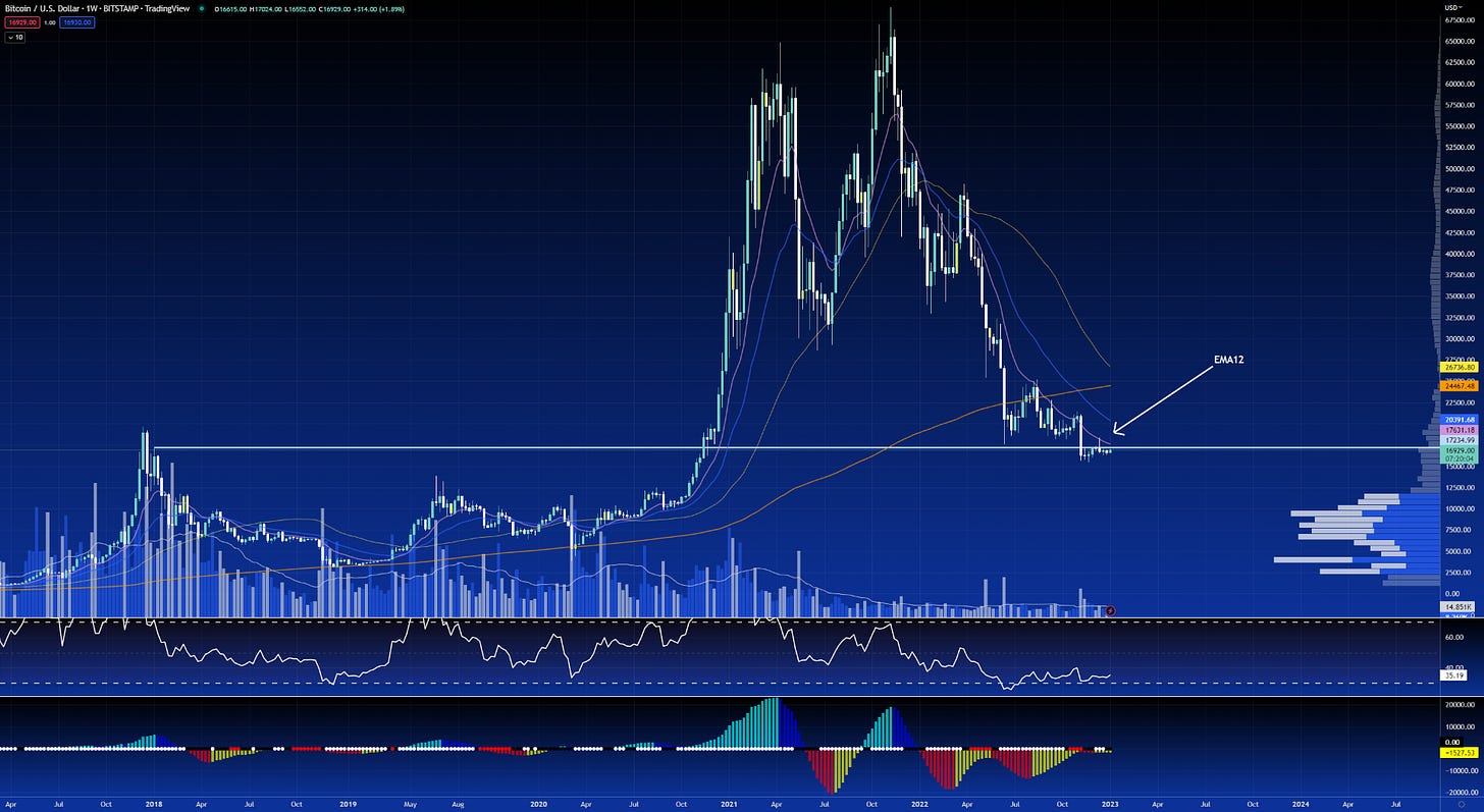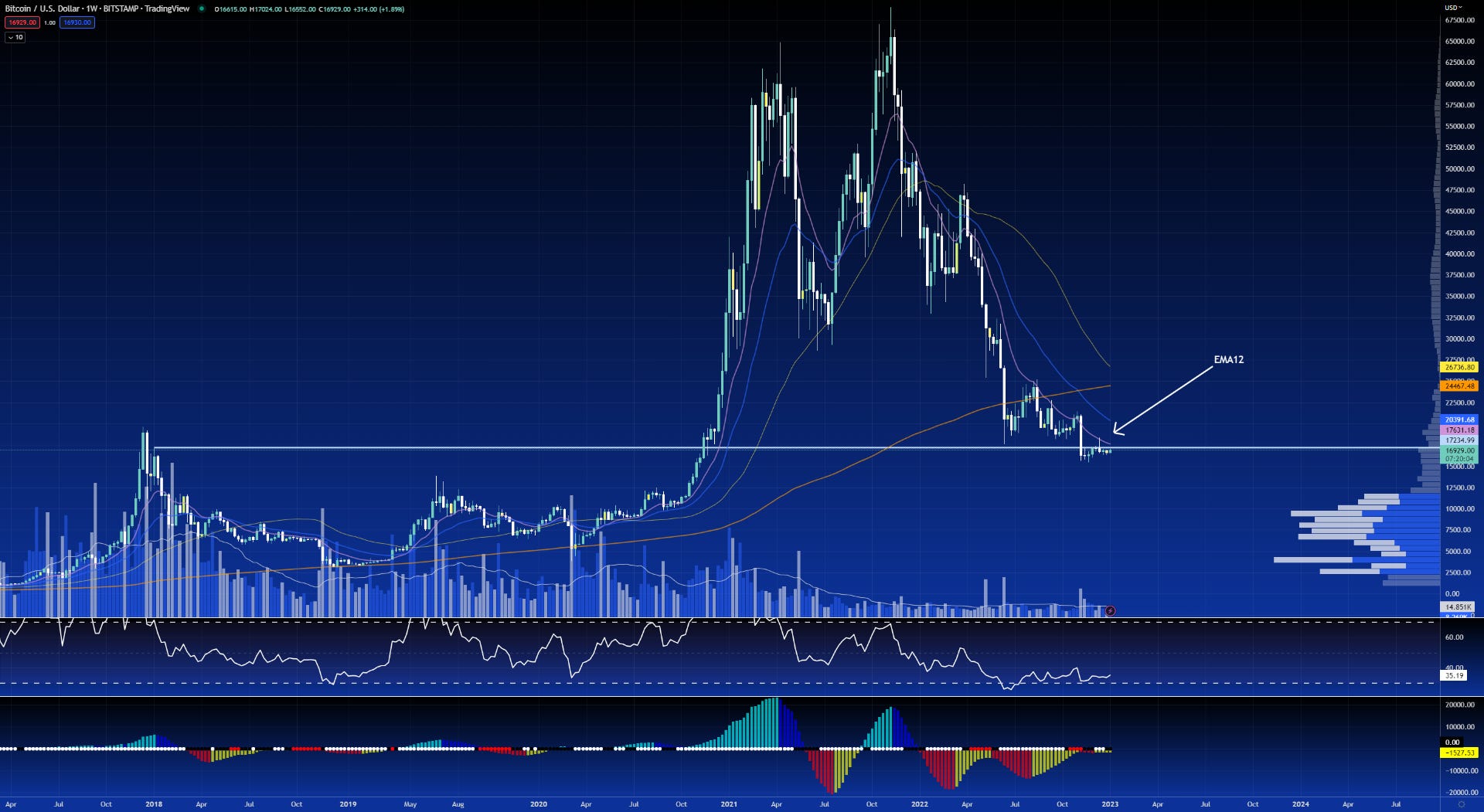 To keep the bigger picture in mind, BTC still is below the EMA12 as resistance and the last weekly rally there was rejected strongly. We are still below the Feb 2018 level of $17,200 and need to be wary of any big prognostications to the bull side until we break through that level with volume.